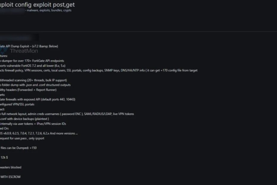 The tool, which is being marketed for a price of $12,000 and comes with escrow services to facilitate transactions, is claimed to target Fortinet’s FortiOS systems by exploiting over 170 unsecured API endpoints, giving attackers the means to harvest a wealth of sensitive information from affected devices.