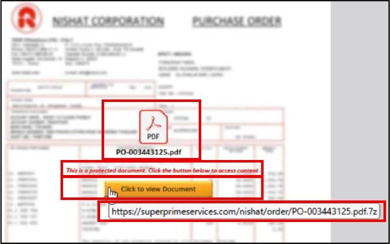When recipients open these PDFs, they encounter a deliberately blurred background designed to create authenticity, accompanied by a message stating the document is protected and requires user interaction to access content.
