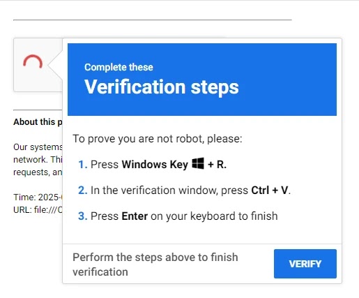 These fake verification screens instruct users to perform seemingly innocuous actions: pressing Windows Key + R to open the Run dialog, followed by Ctrl + V to paste clipboard contents, and finally Enter to execute the command.