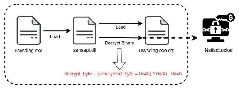 NailaoLocker employs a multi-component delivery system consisting of three carefully orchestrated files: a legitimate executable (usysdiag.exe) used for DLL side-loading, a malicious loader (sensapi.dll), and an obfuscated payload (usysdiag.exe.dat).